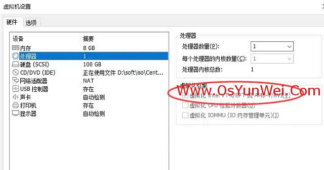 在VMware设置中将作为宿主机的CentOS虚拟机的Intel VT或AMD-V功能打勾选中,开启VT虚拟化,才能在虚拟机中创建虚拟机。
