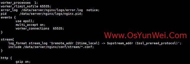 vi /data/server/nginx/conf/nginx.conf #stream块必须在顶层,和 http 是平级的,不能嵌套在 http 内