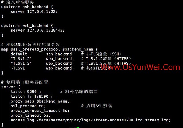 log_format stream_log '$remote_addr [$time_local] -> $upstream_addr ($ssl_preread_protocol)'; #引入日志记录
