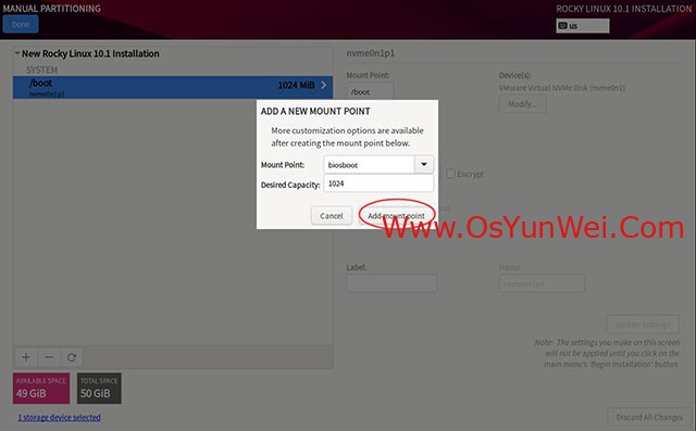 继续创建分区,我们用的是BIOS+GPT引导模式,需要biosboot分区