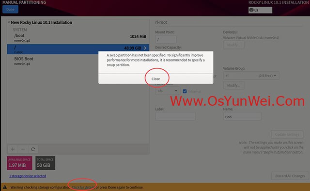 黄色的是警告,提示没有swap分区,直接关闭就行,swap分区可以不用创建