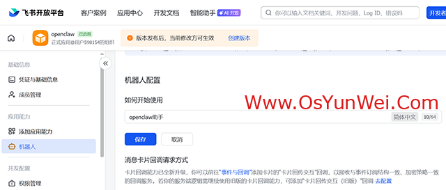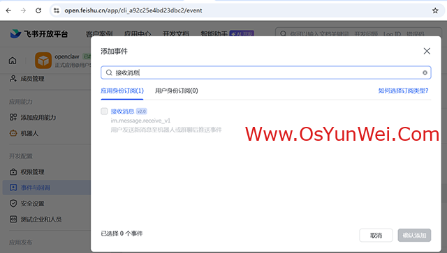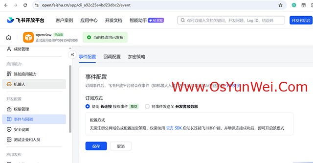 4.6开发配置-事件与回调-事件配置,订阅方式选择“使用 长连接 接收事件” 。然后点击保存。