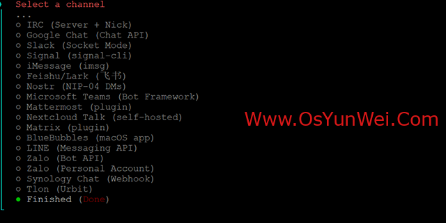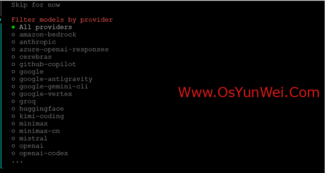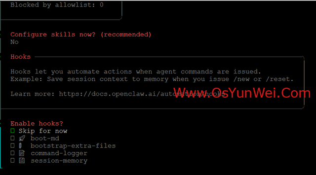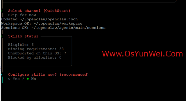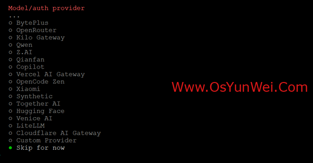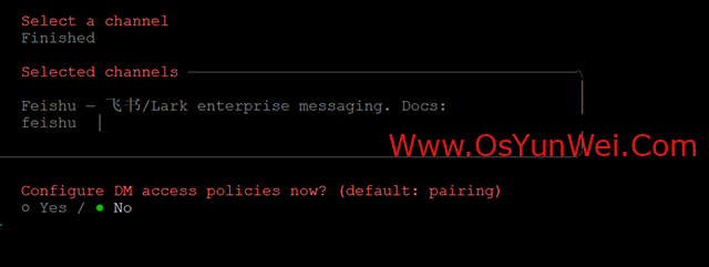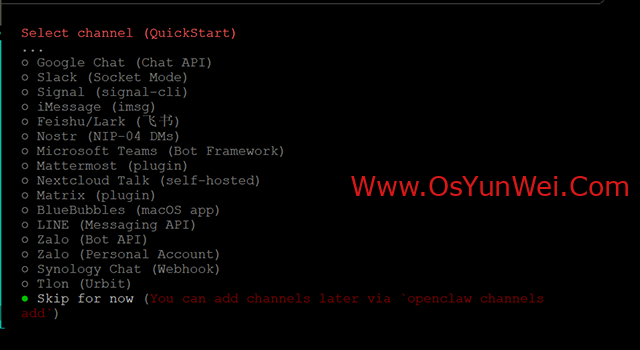 选择 Skip for now(稍后配置渠道)