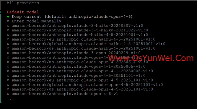 选择 Keep current (default: anthropic/claude-opus-4-6)