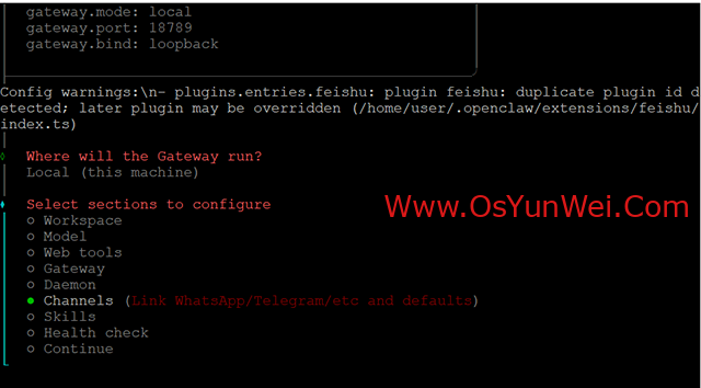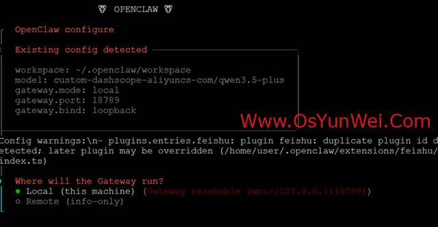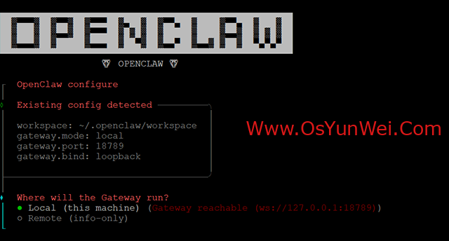 选择:Local (this machine) (Gateway reachable (ws://127.0.0.1:18789))