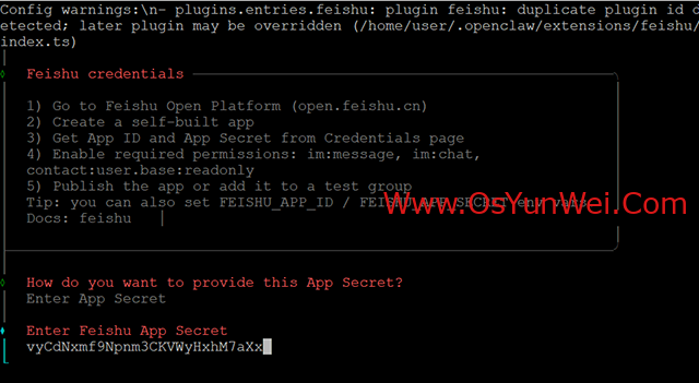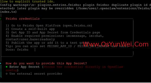 选择: Enter App Secret (Stores the credential directly in OpenClaw config)
