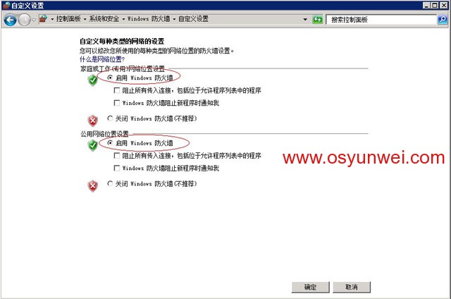 家庭或工作(专用)网络位置设置:启用Windows防火墙